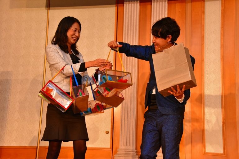 第2部の懇親会が中盤に差し掛かったところで、卒業生有志の方によるビンゴ大会が行われ、多くの景品を目の前にして、ビンゴカードを手に大盛り上がりでした。そして、第2部のメインイベントに、サプライズゲストとしてマジシャン「DAIKI」氏が登場し、華麗な手さばきでスペシャルマジックが披露されました。参加された人々を魅了し、会場は大いに盛り上がり、賞賛の拍手が鳴り響いていました。