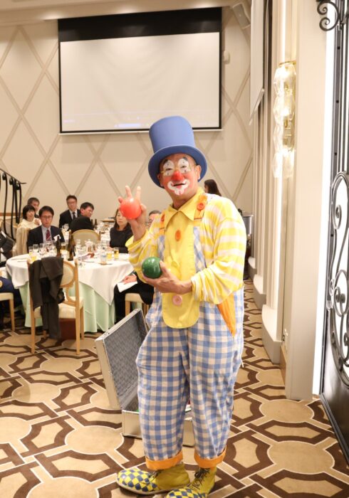 第2部では、菊華高等学校のPTA会長より乾杯のご発声をいただき、しばらく歓談した後、司会者からサプライズとしてスペシャルゲストをお呼びしていることがアナウンスされ、2階からクラウン(道化師・ピエロ)の大棟耕介氏がピエロ姿で登場すると、会場から大きなどよめきが響きわたりました。ピエロによるパフォーマンスが紹介され、滑稽な衣装とコミカルな動きで笑いを取りながら楽しませていました。
