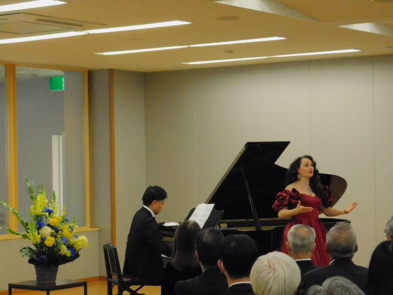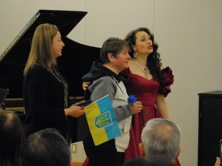 リサイタルのプログラム途中で、ウクライナの平和と故郷への思いを込めて、オクサーナ・ステパニュック氏が、今回特別に参加されたNPO法人日本ウクライナ文化協会理事長の川口リュドミラ氏と一緒にウクライナの歌を歌唱するシーンがあり、とても穏やかで心温まる素敵な時間となりました。