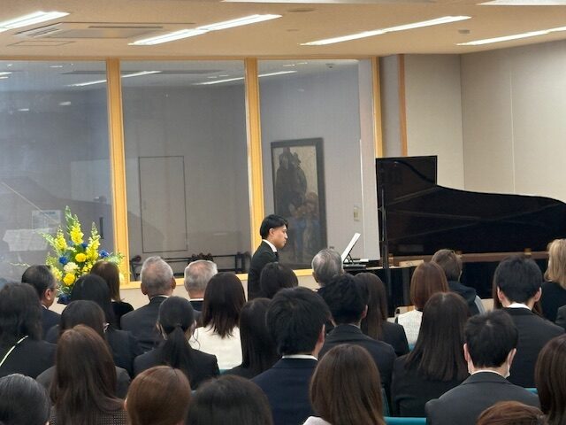 そして、3階大ホールから2階音楽室に移動して、ウクライナの首都キーウ出身で「ウクライナの歌姫」と称されるオペラ歌手で、世界を代表するバンドゥーラ(ウクライナ民族楽器)奏者であるオクサーナ・ステパニュック氏と、歌曲・オペラや弦楽器の伴奏を中心にアンサンブルピアニストとして活動されている尾崎風磨氏による「オクサーナ・ステパニュック ソプラノ・リサイタル」が行われました。最初にオクサーナ・ステパニュック氏が、尾崎風磨氏のピアノ伴奏で「O mio babbino caro(オ・ミオ・バッビーノ・カーロ)」の歌曲を披露すると、透き通る高音と華麗な技巧を駆使した歌声が響き渡り、会場から歓声が上がりました。その後、「キーウの鳥の歌」の歌曲が披露され、続いて、尾崎風磨氏が繊細かつ表現力豊かなに「ひまわり」の曲をピアノソロで演奏されました。そして、オクサーナ・ステパニュック氏は、映画音楽の名曲「サウンド・オブ・ミュージック」など多彩な表現力で8曲を披露されました。すべてのプログラムが終了した後、会場に響き渡る大きな拍手とアンコールの声に応えて、オクサーナ・ステパニュック氏と尾崎風磨氏が再び登場し、「Ave Maria」「Amazing Grace」ウクライナの歌「Києве мій」日本の歌「ふるさと」の4曲が披露され、伸びやかな美しい歌声が参加した教職員を魅了していました。
