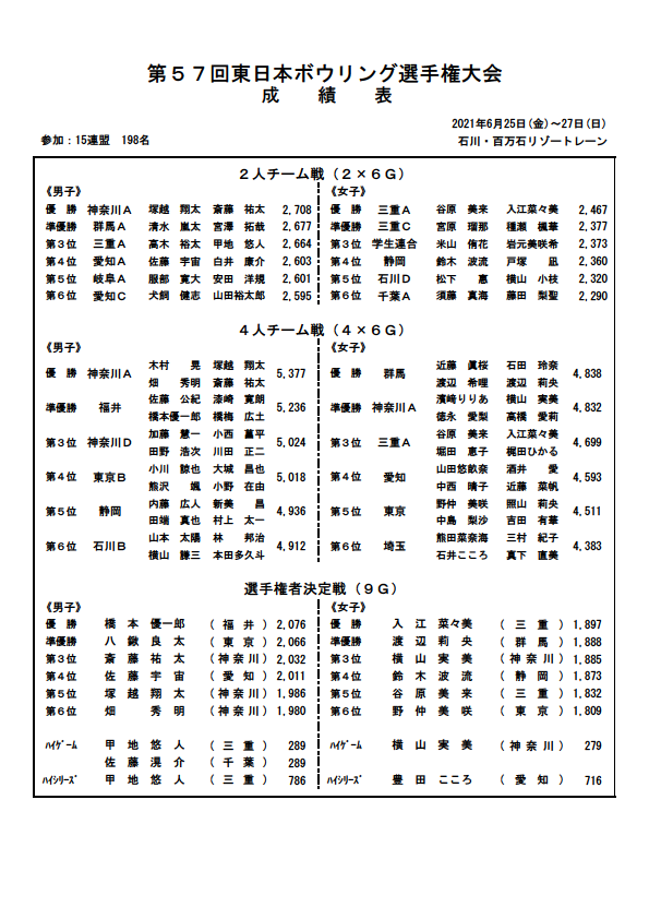 試合は、2人チーム戦の種目で、それぞれ1人6ゲームの競技を行い、米山選手と岩元選手の2選手で合計2,373得点をマークし、ベスト3入りを果たした。